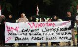 Aktivis dari Himpunan Mahasiswa Islam (HMI) mennggelar Aksi Solidaritas Kemanusiaan atas pembunuhan seorang warga Aceh Imam Maskyur, di Lhokseumawe, Aceh, Jumat (01/09/2023). Mereka meminta Presiden Joko Widodo, Panglima TNI, dan Kapolri menghukum berat oknum anggota Paspampres yang melakukan pembunuhan terhadap warga Desa Mon Keulayu, Gandapura Bireuen, Aceh Imam Maskyur pada 12 Agustus 2023 di Rempoa, Ciputat Timur, Tangerang Selatan. (FOTO : Antara/Rahmad)