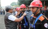 Direktur Network & IT Solution Telkom Herlan Wijanarko mengenakan rompi lapangan kepada petugas lapangan Satgas KTT ASEAN 2023 TelkomGroup. (FOTO : Dok Republika )
