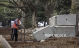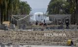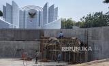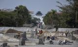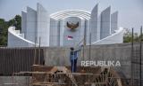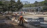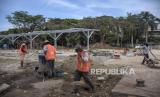 Pekerja menyelesaikan proyek penataan lanjutan dan revitalisasi kawasan Monumen Perjuangan Rakyat Jawa Barat (Monpera) di Kota Bandung, Jawa Barat, Senin (4/9/2023). Pemerintah Provinsi Jawa Barat melakukan penataan dan revitalisasi kawasan Monpera secara berkala yang bakal menjadi kawasan wisata ruang publik dengan sejumlah fasilitas seperti mushola, kawasan kuliner, griya karya, shelter sejarah, tempat bermain dan teater rakyat. Hingga saat ini, progres penataan dan revitalisasi tersebut mencapai 55 persen dan ditargetkan rampung pada akhir tahun 2023. (FOTO : ABDAN SYAKURA/REPUBLIKA)