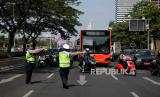 REPUBLIKA.CO.ID,JAKARTA -- Petugas Kepolisian melakukan penutupan sementara saat delegasi KTT ASEAN melintas di ruas jalan Jenderal Sudirman, Jakarta, Senin (4/9/2023).