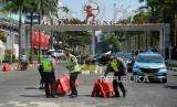 Petugas Kepolisian merapikan pembatas jalan saat melakukan rekayasa lalu lintas di kawasan FX Sudirman, Jakarta, Senin (4/9/2023). Polda Metro Jaya bersama pemprov DKI Jakarta melakukan rekayasa lalu lintas di 29 ruas jalan di sekitar lokasi KKT ASEAN selama rangkaian kegiatan KTT ASEAN berlangsung. (FOTO : Republika/Thoudy Badai)