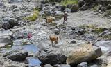 Seorang warga menggiring ternak sapinya melintasi sungai yang airnya menyusut di Desa Pusuk Lestari, Kecamatan Batulayar, Lombok Barat, NTB, Senin (4/9/2023). Badan Meteorologi Klimatologi dan Geofisika (BMKG) NTB merilis, curah hujan di wilayah NTB pada dasarian III Agustus 2023 terpantau dalam kategori rendah (0 - 20 mm/das) di seluruh wilayah NTB sehingga masyarakat diimbau agar meningkatkan kewaspadaan terhadap potensi bencana kebakaran hutan, lahan dan kekeringan yang umumnya terjadi selama puncak musim kemarau. (FOTO : Antara/Ahmad Subaidi)