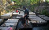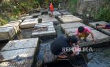 REPUBLIKA.CO.ID, BANTUL -- Warga mengecek kondisi ikan dalam keramba di Sungai Widuri, Keloran, Bantul, Yogyakarta, Senin (4/9/2023).
