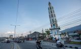 REPUBLIKA.CO.ID, PALU -- Pengendara melintas di dekat menara Masjid Al-Mujahidin yang miring di Kelurahan Silae, Palu, Sulawesi Tengah, Senin (4/9/2023).