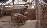 Pekerja membawa batu bata merah untuk dibakar di Cihampelas, Kabupaten Bandung Barat, Jawa Barat, Selasa (5/9/2023). Berdasarkan keterangan pekerja, saat musim kemarau produksi batu bata mengalami peningkatan dari 3.000 menjadi 6.000 buah per hari yang dijual dengan harga Rp650 per buah. (FOTO : ABDAN SYAKURA/REPUBLIKA)
