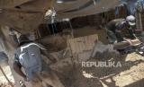 Pekerja membawa batu bata merah yang sudah dibakar di Cihampelas, Kabupaten Bandung Barat, Jawa Barat, Selasa (5/9/2023). Berdasarkan keterangan pekerja, saat musim kemarau produksi batu bata mengalami peningkatan dari 3.000 menjadi 6.000 buah per hari yang dijual dengan harga Rp650 per buah. (FOTO : ABDAN SYAKURA/REPUBLIKA)