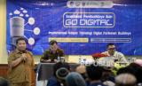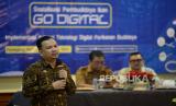Kepala Dinas Perikanan Kab. Pandeglang Budi S. Januardi memberikan paparan saat menjadi narasumber dalam acara Sosialisasi Pembudidaya Ikan Go Digital di Pandeglang, Banten, Selasa (5/9/2023). Kementerian Komunikasi dan Informatika berkolaborasi dengan startup aquaculture eFishery dalam menerapkan implementasi adopsi teknologi digital berupa peminjaman Automatic Feeder atau alat pakan otomatis kepada 10 pembudidaya ikan terpilih di Pandeglang, Banten. Penerapan teknologi seperti Automatic Feeder pada proses budidaya perikanan tersebut diharapkan bisa membantu dan memudahkan para pembudidaya dalam pemberian pakan dan meningkatkan tingkat efektivitas yang dapat mengoptimalkan pakan yang diberikan dan meminimalisir pakan yang terbuang serta bisa menambah potensi penghasilan bagi para pembudidaya. (FOTO : Republika/Prayogi)