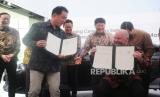 Presdir Hyundai Motor Indonesia Woojune Cha (kiri), CMO PT Lippo Malls Indonesia Danny Crayon (kanan) menunjukkan draft saat penandatanganan kerjasama di Jakarta, Selasa (5/9/2023). PT Hyundai Motors Indonesia, bekerjasama dengan PT Lippo Malls Indonesia (LMI), akan memperluas jaringan charging station untuk kendaraan listrik (EV) di 52 pusat perbelanjaan di bawah naungan LMI di berbagai kota di Indonesia. (FOTO : Republika/ Tahta Aidilla)