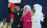 Ridwan Kamil berserta istri Atalia Praratya menyampaikan sambutan saat Pisah Sambut dan Prosesi Pelepasan Gubernur Jawa Barat Masa Bakti 2018-2023, di Aula Barat Gedung Sate, Kota Bandung, Selasa (5/9/2023). Bey Machmudin resmi menjadi Penjabat (Pj) Gubernur Jawa Barat menggantikan Gubernur Jawa Barat periode 2018-2023 Ridwan Kamil yang purnatugas, Selasa 5 September 2023. Bey Machmudin sebelumnya merupakan pejabat eselon di lingkungan Sekretariat Presiden. Ia menjabat Deputi bidang Protokol, Pers, dan Media Sekretariat Presiden. (FOTO : Edi Yusuf/Republika)
