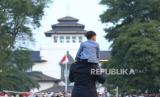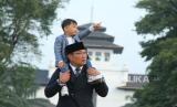 Ridwan Kamil sambil mengendong anak bungsunya Arkana Aidan Misbach berjalan-jalan di Lapangan Gasibu usai Pisah Sambut dan Prosesi Pelepasan Gubernur Jawa Barat Masa Bakti 2018-2023, di Gedung Sate, Kota Bandung, Selasa (5/9/2023). Bey Machmudin resmi menjadi Penjabat (Pj) Gubernur Jawa Barat menggantikan Gubernur Jawa Barat periode 2018-2023 Ridwan Kamil yang purnatugas, Selasa 5 September 2023. Bey Machmudin sebelumnya merupakan pejabat eselon di lingkungan Sekretariat Presiden. Ia menjabat Deputi bidang Protokol, Pers, dan Media Sekretariat Presiden. (FOTO : Edi Yusuf/Republika)