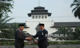 Ridwan Kamil menyerahkan kujang kepada Penjabat (Pj) Gubernur Jawa Barat Bey Machmudin saat Pisah Sambut dan Prosesi Pelepasan Gubernur Jawa Barat Masa Bakti 2018-2023, di Aula Barat Gedung Sate, Kota Bandung, Selasa (5/9/2023). Bey Machmudin resmi menjadi Pj Gubernur Jawa Barat menggantikan Gubernur Jawa Barat periode 2018-2023 Ridwan Kamil yang purnatugas, Selasa 5 September 2023. Bey Machmudin sebelumnya merupakan pejabat eselon di lingkungan Sekretariat Presiden. Ia menjabat Deputi bidang Protokol, Pers, dan Media Sekretariat Presiden. (FOTO : Edi Yusuf/Republika)