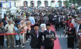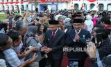 REPUBLIKA.CO.ID, BANDUNG -- Penjabat (Pj) Gubernur Jawa Barat Bey Machmudin dan Ridwan Kamil menyapa warga saat Pisah Sambut dan Prosesi Pelepasan Gubernur Jawa Barat Masa Bakti 2018-2023, di Aula Barat Gedung Sate, Kota Bandung, Selasa (5/9/2023).