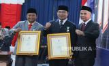 Penjabat (Pj) Gubernur Jawa Barat Bey Machmudin (kanan) memberikan penghargaan kepada Ridwan Kamil dan Uu Ruzhanul Ulum saat Pisah Sambut dan Prosesi Pelepasan Gubernur Jawa Barat Masa Bakti 2018-2023, di Aula Barat Gedung Sate, Kota Bandung, Selasa (5/9/2023). Bey Machmudin resmi menjadi Pj Gubernur Jawa Barat menggantikan Gubernur Jawa Barat periode 2018-2023 Ridwan Kamil yang purnatugas, Selasa 5 September 2023. Bey Machmudin sebelumnya merupakan pejabat eselon di lingkungan Sekretariat Presiden. Ia menjabat Deputi bidang Protokol, Pers, dan Media Sekretariat Presiden. (FOTO : Edi Yusuf/Republika)