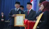 Penjabat (Pj) Gubernur Jawa Barat Bey Machmudin memberikan penghargaan kepada Ridwan Kamil saat Pisah Sambut dan Prosesi Pelepasan Gubernur Jawa Barat Masa Bakti 2018-2023, di Aula Barat Gedung Sate, Kota Bandung, Selasa (5/9/2023). Bey Machmudin resmi menjadi Pj Gubernur Jawa Barat menggantikan Gubernur Jawa Barat periode 2018-2023 Ridwan Kamil yang purnatugas, Selasa 5 September 2023. Bey Machmudin sebelumnya merupakan pejabat eselon di lingkungan Sekretariat Presiden. Ia menjabat Deputi bidang Protokol, Pers, dan Media Sekretariat Presiden. (FOTO : Edi Yusuf/Republika)