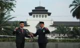 Penjabat (Pj) Gubernur Jawa Barat Bey Machmudin dan Ridwan Kamil menyapa warga saat Pisah Sambut dan Prosesi Pelepasan Gubernur Jawa Barat Masa Bakti 2018-2023, di Gedung Sate, Kota Bandung, Selasa (5/9/2023). Bey Machmudin resmi menjadi Pj Gubernur Jawa Barat menggantikan Gubernur Jawa Barat periode 2018-2023 Ridwan Kamil yang purnatugas, Selasa 5 September 2023. Bey Machmudin sebelumnya merupakan pejabat eselon di lingkungan Sekretariat Presiden. Ia menjabat Deputi bidang Protokol, Pers, dan Media Sekretariat Presiden. (FOTO : Edi Yusuf/Republika)