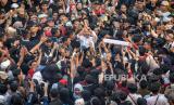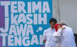 REPUBLIKA.CO.ID, SEMARANG -- Gubernur Jawa Tengah Ganjar Pranowo (tengah) menyapa warga seusai memberikan pidato pada perpisahan bertajuk Pesta Rakyat Terima Kasih Jawa Tengah di halaman Kantor Gubernur Jawa Tengah, Semarang, Jawa Tengah, Selasa (5/9/2023).