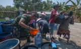 Anggota Babinsa Kodim 0724/Boyolali membantu warga saat distribusi air yang dilakukan Badan Penanggulangan Bencana Daerah (BPBD) Kabupaten Boyolali di Sarimulyo, Kemusu, Boyolali, Jawa Tengah, Selasa (5/9/2023). Berdasarkan data Badan Penanggulangan Bencana Daerah (BPBD) Kabupaten Boyolali per (4/9/2023) telah mengirimkan sebanyak 195 tangki atau 1.043.000 liter air ke tujuh kecamatan di Kabupaten Boyolali yang terdampak musim kemarau. (FOTO : ANTARA FOTO/Aloysius Jarot Nugroho)