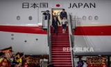 Perdana Menteri Jepang Fumio Kishida (kiri) bersama istri Yuko Kishida (kanan) menuruni tangga saat tiba di Terminal VVIP Bandara Soekarno Hatta, Banten, Selasa (5/9/2023).  (FOTO : ANTARA FOTO/Media Center KTT ASEAN 2023/Raisa)