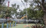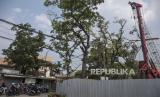 Pekerja menggunakan alat berat menebang pohon untuk proyek Jalan Layang (Fly Over) Ciroyom di depan Rumah Potong Hewan (RPH) Ciroyom DKPP Kota Bandung, Jalan Arjuna, Kota Bandung, Jawa Barat, Rabu (6/9/2023). Pos jaga dan sebagian bangunan bagian depan yang menjadi ikon cagar budaya kelas A yang telah ada dari tahun 1935 tersebut terancam terkena imbas dari proyek pembangunan Fly Over Ciroyom. Proyek Fly Over tersebut bertujuan untuk memudahkan operasional feeder Kereta Cepat Jakarta - Bandung yang akan beroperasi dalam waktu dekat. (FOTO : ABDAN SYAKURA/REPUBLIKA)