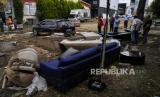 Orang-orang berdiri di samping kendaraan dan perabotan yang berserakan pasca banjir akibat hujan lebat di Istanbul, Turki, Rabu, (6/9/2023). (FOTO : AP)