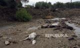 Seekor hewan mati tergeletak di lumpur setelah hujan lebat di Volos, Yunani tengah, Rabu, (6/8/2023). (FOTO : AP Photo/Thodoris Nikolaou)