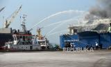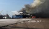 REPUBLIKA.CO.ID, MERAK -- Sejumlah petugas pemadam kebakaran menyemprotkan air untuk memadamkan kobaran api yang membakar kapal Ferry KMP Mutiara Berkah I yang terbakar saat akan sandar di Pelabuhan Indah Kiat, Merak, Banten, Rabu (6/9/2023).
