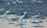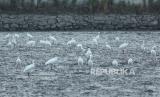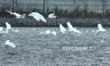 Kawanan burung bangau mencari makan di rawa yang sudah surut akibat kemarau di daerah Sapan, Kabupaten Bandung, Rabu (6/9/2023). Areal rawa, selain berfungsi sebagai kolam retensi, juga salah satu pemasok air untuk sawah. (FOTO : Edi Yusuf/Republika)