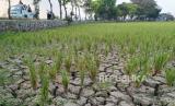 Tanaman padi mulai menguning akibat kekeringan di saat kemarau di daerah Sapan, Kabupaten Bandung, Rabu (6/9/2023). Akibat kemarau banyak areal sawah di Bandung Raya terancam gagal tanam dan gagal panen. (FOTO : Edi Yusuf/Republika)