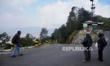 Sejumlah petugas berjaga di pintu masuk Pos Jemplang, Malang, Jawa Timur, Kamis (7/9/2023). Balai Besar Taman Nasional Bromo Tengger Semeru (BB TNBTS) menutup total aktivitas wisata dari semua pintu masuk menuju kawasan Gunung Bromo, penutupan tersebut dilakukan untuk kelancaran proses pemadaman dan keamanan pengunjung akibat kebakaran yang terjadi di Blok Savana Lembah Watangan atau Bukit Telletubies pada Rabu (6/9). (FOTO : ANTARA FOTO/Irfan Sumanjaya)
