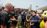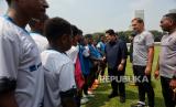Ketua Umum PSSI Erick Thohir (ketiga kanan) didampingi Direktur Papua Football Academy Wofgang Pikal (kedua kanan) berbincang bersama siswa dari Papua Football Academy saat coaching clinic di Stadion Madya, Senayan, Jakarta, Jumat (8/9/2023). BVB Legends Tour Indonesia bersama PSSI menggelar coaching clinic dengan mendatangkan tiga legenda Borussia Dortmund yakni Paul Lambert, Joerg Heinrich dan Marcel Schmelzer untuk memberikan pelatihan sepakbola kepada siswa Papua Football Academy. (FOTO : Republika/Thoudy Badai)