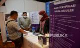 Pengunjung berkonsultasi terkait sertifikasi halal di acara Halal Fair di Menara 165, TB Simatupang, Jakarta, Jumat (8/9/2023). Kegiatan halal fair tersebut diselenggarakan oleh PT Grha 165 untuk pertama kalinya dengan mengangkat tema Halal Way To Life yang berlangsung hingga Ahad 10 September 2023 mendatang. Halal fair menyajikan beragam kegiatan seperti talk show dengan tema seputar halal, serta menyuguhkan sebanyak 115 stan UMKM dari beragam produk halal mulai dari makanan, fashion, jasa layanan travel, pariwisata, layanan keuangan hingga produk kecantikan. (FOTO : Republika/Thoudy Badai)