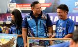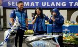 Ketua Umum Partai Demokrat Agus Harimurti Yudhoyono bersama isteri Annisa Pohan berbincang dengan penerima hadiah dalam acara HUT ke-22 Partai Demokrat di DPP Partai Demokrat, Jakarta, Sabtu (9/9/2023). Peringatan HUT ke-22 Partai Demokrat tersebut digelar secara sederhana dan diisi oleh serangkaian acara seperti lomba lukis, donor darah, hingga menghias nasi tumpeng. (FOTO : Republika/Prayogi)