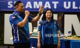 Ketua Umum Partai Demokrat Agus Harimurti Yudhoyono bersama Istri Annisa Pohan berbincang memberikan sambutan dalam acara HUT ke-22 Partai Demokrat di DPP Partai Demokrat, Jakarta, Sabtu (9/9/2023). Peringatan HUT ke-22 Partai Demokrat tersebut digelar secara sederhana dan diisi oleh serangkaian acara seperti lomba lukis, donor darah, hingga menghias nasi tumpeng. (FOTO : Republika/Prayogi)