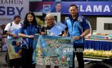 Ketua Umum Partai Demokrat Agus Harimurti Yudhoyono bersama istri Annisa Pohan memberikan hadiah kepada pemenang lomba lukis dalam acara HUT ke-22 Partai Demokrat di DPP Partai Demokrat, Jakarta, Sabtu (9/9/2023). Perayaan HUT ke-22 Partai Demokrat tersebut digelar secara sederhana dan diisi oleh serangkaian acara seperti lomba lukis, donor darah, hingga menghias nasi tumpeng. (FOTO : Republika/Prayogi)