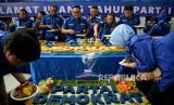 Para keder Partai Demokrat mengambil tumpeng yang disediakan dalam acara HUT ke-22 Partai Demokrat di DPP Partai Demokrat, Jakarta, Sabtu (9/9/2023). Peringatan HUT ke-22 Partai Demokrat tersebut digelar secara sederhana dan diisi oleh serangkaian acara seperti lomba lukis, donor darah, hingga menghias nasi tumpeng. (FOTO : Republika/Prayogi)