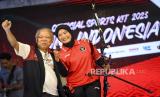 Chef de Mission (CdM) Tim Indonesia di Asian Games 2022 Basuki Hadimuljono (kiri) berpose bersama Atlet Panahan Diananda Choirunnisa (kanan) saat peluncuran seragam Ofisial Tim Indonesia untuk Asian Games 2022 di Kantor Komite Olimpiade Indonesia (KOI) di Jakarta, Sabtu (9/9/2023). Indonesia akan mengirimkan sebanyakl 415 atlet dari 31 cabang olahraga Asian Games 2022 yang menargetkan minimal menempati 12 besar dengan perolehan 12 medali emas. (FOTO : ANTARA FOTO/M Risyal Hidayat)