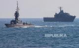 Kapal perang Singapura RSS Endeavour-210 dan RSS Vigour-92 berlayar membentuk formasi pada Latihan Gabungan Bersama (Latgabma) photo exercise (photo ex) Super Garuda Shield 2023 di Laut Jawa, Madura, Jawa Timur, Sabtu (9/9/2023). Latihan yang melibatkan tujuh kapal perang dari Indonesia, Singapura dan Amerika itu membentuk formasi Garuda Shield. (FOTO : ANTARA FOTO/Rizal Hanafi)