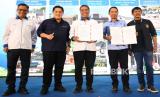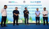 Menteri BUMN Erick Thohir (kedua kiri), menyaksikan Direktur Consumer Bank BTN Hirwandi Gafar (tengah) dan Sekjen PSSI Yunus Nusi (kedua kanan) melakukan penandatanganan Nota Kesepahaman terkait kerjasama Penyediaan Jasa Layanan Perbankan di Sidoarjo, Sabtu (9/9/2023). Kolaborasi antara Bank BTN dan PSSI akan memberikan kemudahan bagi para pelaku olahraga sepakbola untuk bisa memiliki rumah impian yang terjangkau dan layak huni. Pada kesempatan yang sama Bank BTN memberikan persetujuan KPR kepada Indra Sjafrie yang merupakan Direktur Teknik PSSI. (FOTO : Dok Republika)