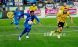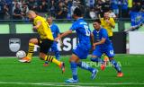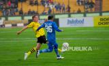 Striker Persib Bandung All Stars Zaenal Arif ditempel ketat melawan bek Borussia Dortmund Legends di Stadion Siliwangi Bandung, Ahad (10/9/2023). Laga berakhir dengan skor 4-0 untuk kemenangan tim tamu Borussia Dortmund Legends. Kedua tim memainkan sejumlah pemain pilar di era masing-masing, (FOTO : Republika/Yogi Ardhi)