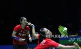 REPUBLIKA.CO.ID,DELI SERDANG -- Pebulu tangkis ganda putri Indonesia Lanny Tria Mayasari (kanan) dan Ribka Sugiarto (kiri) berusaha mengembalikan kok ke arah lawannya ganda putri China Chan Ching Hui dan Yang Ching Tun pada final BNI Indonesia Master I 2023 di GOR PBSI Sumut, Pancing, Kabupaten Deli Serdang, Sumatera Utara, Ahad (10/9/2023).