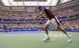 Novak Djokovic, dari Serbia, membalas pukulannya ke Daniil Medvedev, dari Rusia, pada final tunggal putra kejuaraan tenis AS Terbuka di New York, Ahad, (10/9/2023). (FOTO : AP Photo/Mary Altaffer)