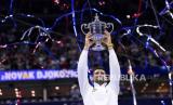 Novak Djokovic, dari Serbia, mengangkat trofi juara setelah mengalahkan Daniil Medvedev, dari Rusia, pada final tunggal putra kejuaraan tenis AS Terbuka di New York. Ahad, (10/9/2023). (FOTO : AP Photo/Manu Fernandez)