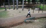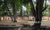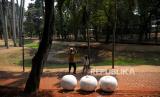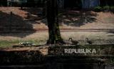 Warga beraktivitas di Taman Langsat, Jakarta Selatan, Senin (11/9/2023). Menurut petugas, kondisi Taman Langsat mengalami kekeringan usai dilanda musim kemarau sejak dua bulan yang lalu. Hal tersebut mengakibatkan danau buatan di taman tersebut surut, serta kondisi rumput yang kering. (FOTO : Republika/Thoudy Badai)