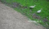 Angsa berada di Taman Langsat, Jakarta Selatan, Senin (11/9/2023). Menurut petugas, kondisi Taman Langsat mengalami kekeringan usai dilanda musim kemarau sejak dua bulan yang lalu. Hal tersebut mengakibatkan danau buatan di taman tersebut surut, serta kondisi rumput yang kering. (FOTO : Republika/Thoudy Badai)