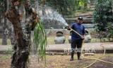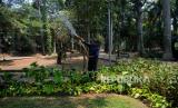 Petugas menyiram tanaman di Taman Langsat, Jakarta Selatan, Senin (11/9/2023). Menurut petugas, kondisi Taman Langsat mengalami kekeringan usai dilanda musim kemarau sejak dua bulan yang lalu. Hal tersebut mengakibatkan danau buatan di taman tersebut surut, serta kondisi rumput yang kering. (FOTO : Republika/Thoudy Badai)