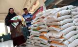 Warga penerima bantuan saat penyaluran bantuan pangan cadangan beras di Desa Tugusumberjo, Kecamatan Peterongan, Kabupaten Jombang, Jawa Timur, Senin (11/9/2023). Pemerintah daerah bersama Bulog dan Kantor Pos menyalurkan bantuan pangan tahap dua ini kepada 114.000 penerima bantuan pangan di Kabupaten Jombang dengan total beras sebanyak 1.140.000 ton per bulannya dengan alokasi 10 kilogram per keluarga. (FOTO : ANTARA FOTO/Syaiful Arif)