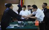 REPUBLIKA.CO.ID,BANDUNG -- Direktur dan Manajer PT Sarana Mitra Adiguna (PT SMA), Benny dan Andreas Guntoro mengikuti sidang vonis di Pengadian Tipikor Bandung, Jalan LRE Martadinata, Kota Bandung, Senin (11/9/2023).