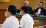 Direktur dan Manajer PT Sarana Mitra Adiguna (PT SMA), Benny dan Andreas Guntoro mengikuti sidang vonis di Pengadian Tipikor Bandung, Jalan LRE Martadinata, Kota Bandung, Senin (11/9/2023). Keduanya dinyatakan terbukti bersalah telah memberi suap kepada Wali Kota Bandung nonaktif Yana Mulyana, pejabat Dishub Dadang Darmawan dan Khairur Rijal. Hakim menjatuhkan pidana terhadap kedua terdakwa 2 tahun penjara dengan denda Rp 100 juta subsidair 3 bulan kurungan. (FOTO : Edi Yusuf/Republika)