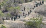Sejumlah prajurit Jepang membentuk formasi saat operasi pendaratan dalam Latihan Gabungan Bersama (Latgabma) di Pusat Latihan Pertempuran Marinir (Puslatpurmar) 5 Baluran, Karangtekok, Situbondo, Jawa Timur, Ahad (10/9/2023). (FOTO : AP Photo/Tatan Syuflana)