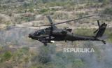 Helikopter Aphace AH60 milik US Army melaksanakan bantuan tembakan udara pada operasi serangan darat Latihan Gabungan Bersama (Latgabma) di Pusat Latihan Pertempuran Marinir (Puslatpurmar) 5 Baluran, Karangtekok, Situbondo, Jawa Timur, Senin (11/9/2023). (FOTO : AP Photo/Tatan Syuflana)